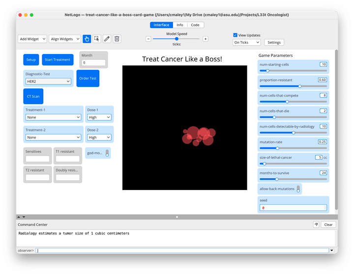 We wrote a simulation game in Netlogo to illustrate the challenges of treating cancer, when our therapies often just kill the sensitive cells and leave behind mutant cells that are resistant to our therapies. All you need to do is download the free Netlogo platform and then download the game here and unzip it. Open the game from within Netlogo and try your hand at curing breast cancer. Instructions are in the Info tab.